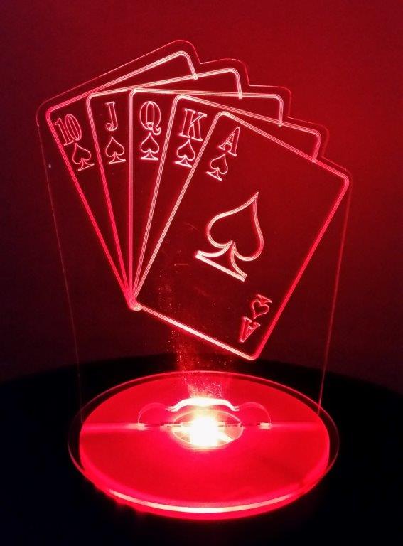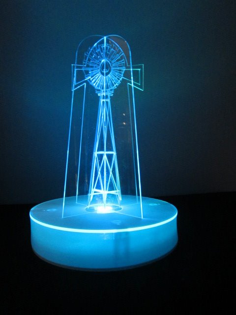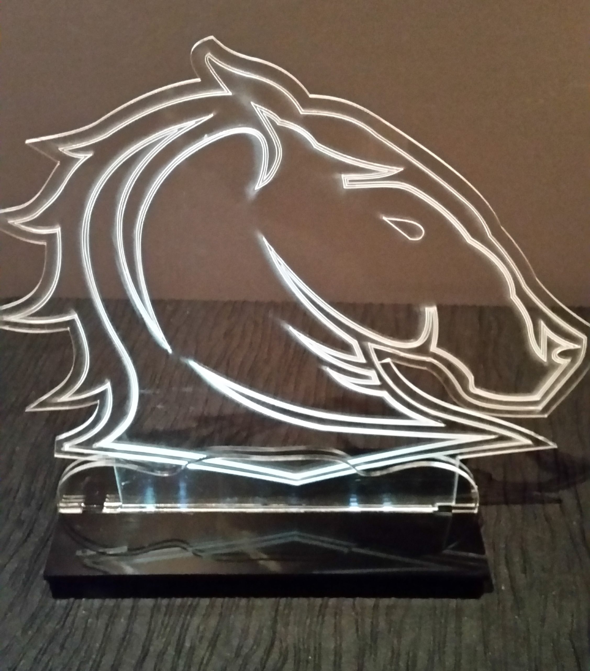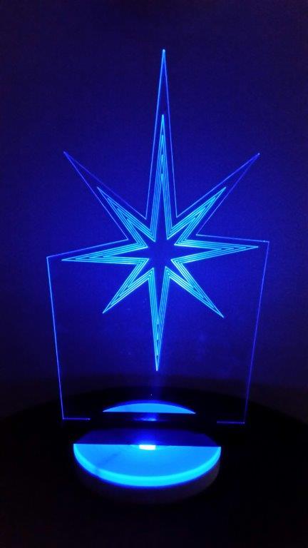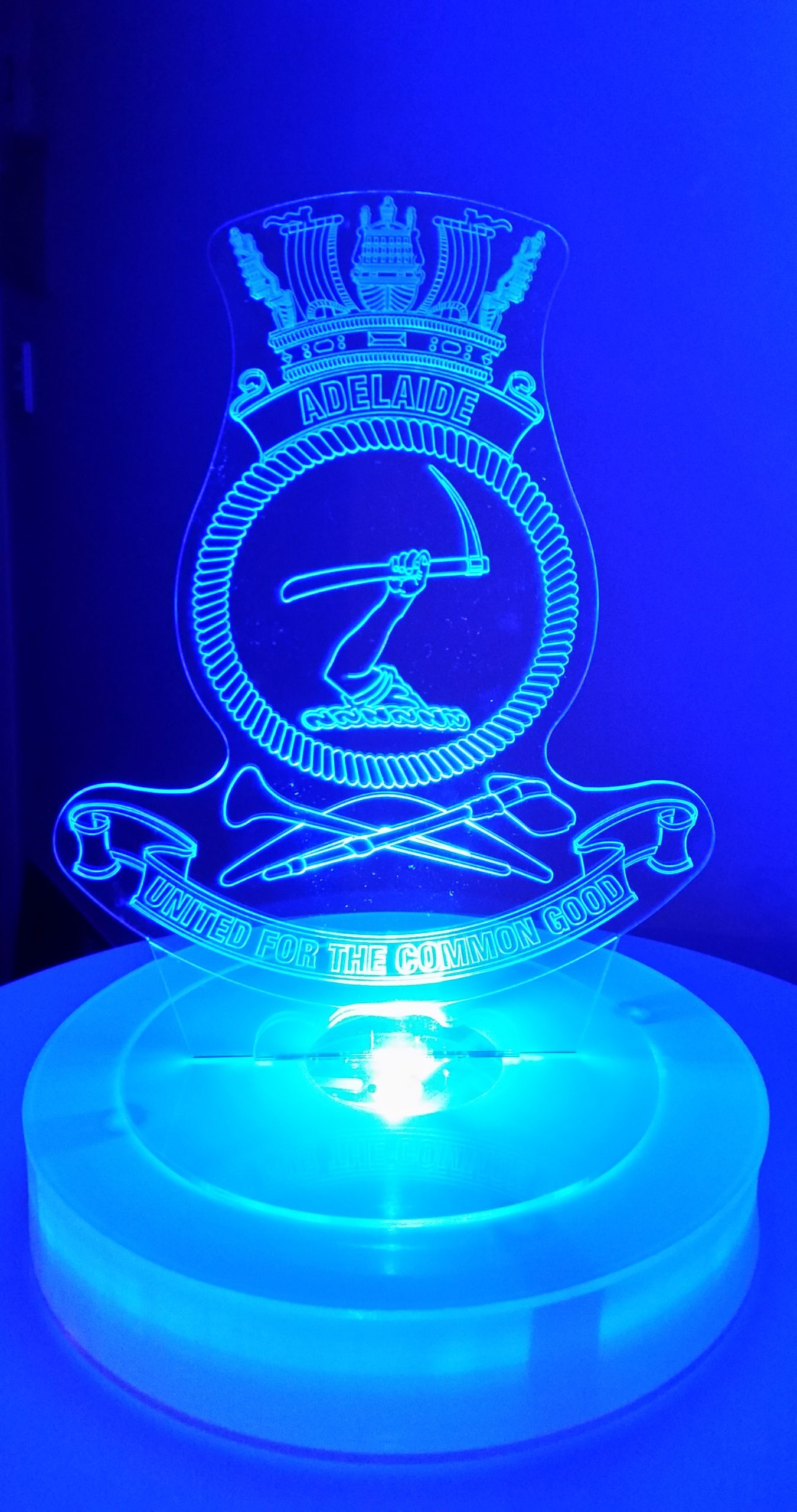 These can be one dimensional, 2 or 3 dimensional. The lighting in the customised light base will illuminate the piece utilizing in the available LED colours, or alternatively, we can supply a multi-coloured/colour changing/remote controlled, LED Light within the base.